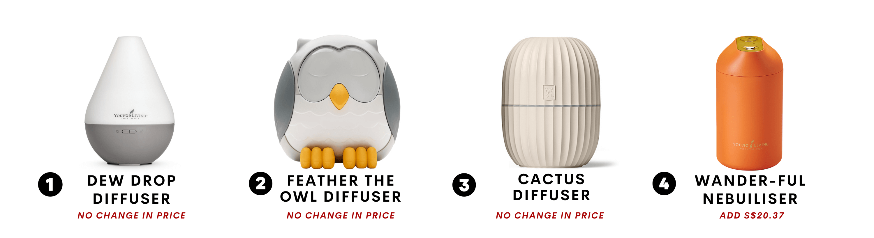 You can also choose to customize your Premium Experience Bundle (PEB) with a diffuser of your choice. You may choose the diffuser you want and “upgrade” your PEB accordingly. Do refer to the graphic below for more information on the various options as well as the price upgrades. (Please note that the availability of the options of diffusers may differ from time to time and also from market to market. Do check with the friend who has introduced you!)